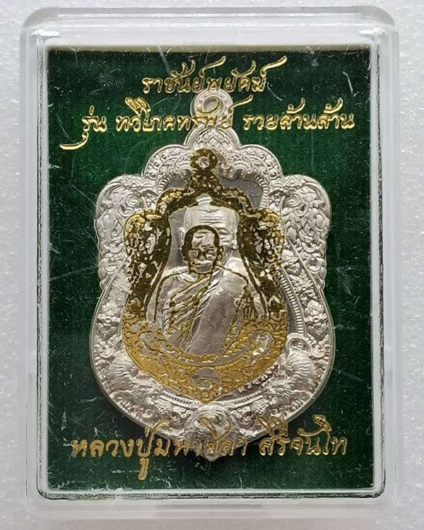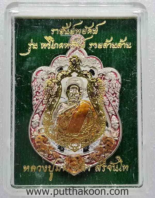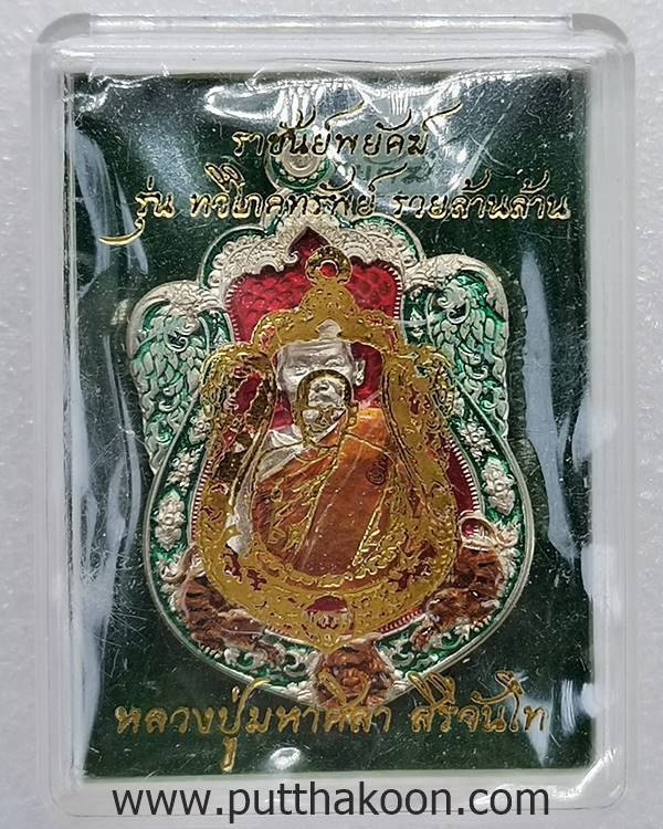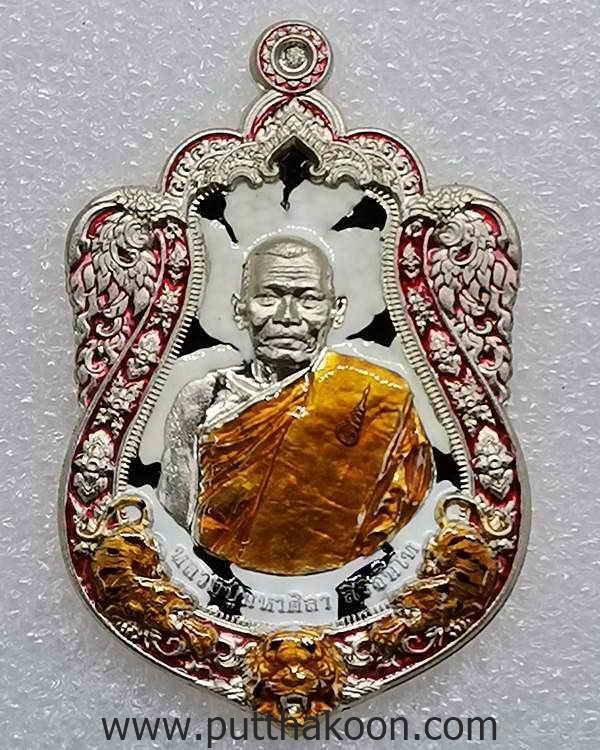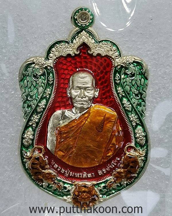 ทวีโภคทรัพย์ รวยล้านล้าน ปี 64 (ราชันย์พยัคฆ์) หลวงปู่มหาศิลา สิริจันโท วัดโพธิ์ศรีสะอาด จ.กาฬสินธุ์ เนื้ออัลปาก้าลงยาลายเสือขาว โค้ด 2 จุด เลข ๑๙๘ สร้าง 899 เหรียญ แบ่งเป็นลายเสือขาว 600 เหรียญ ลงยาแดง 299 เหรียญ มีกล่อง 1,600 บาท